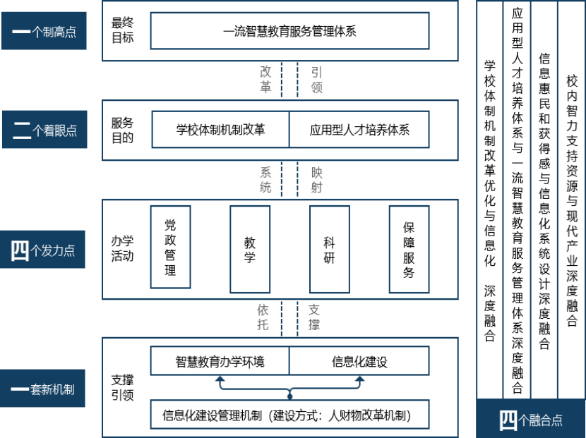 “一一二四四”工程以习近平网络强国战略和45612藏宝阁资料创建特色社会主义大学深度融合的思想为指导,坚持“以人为本”的教育信息化理念,对标先进的高等教育信息化典范,打造智慧教育服务管理体系,抢占教育信息化制高点(一个制高点),借力健全完善的信息化建设创新管理机制(一套新机制),推动学校机制体制改革优化和人才培养模式创新(二个着眼点),促进应用型人才培养体系与智慧教育服务管理体系深度融合,信息惠民和获得感与信息化系统设计深度融合,学校机制体制改革优化与信息化深度融合,校内智力支持资源与现代产业深度融合(四个融合点),以服务于党政管理、教学科研、保障服务和基础建设升级(四个发力点),最终助力现代大学治理方式的迭代演进和优化。