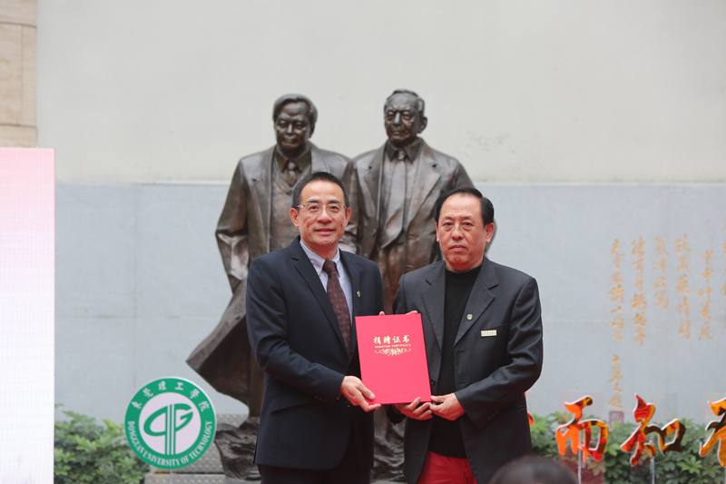 荣休典礼上,刘治猛教授向学校捐赠了8件旧物,包括我校作为第一专利权人获得的第一项发明专利证书(第100001号)、作为主持单位第一次获得的广东省科学技术奖三等奖证书、作为主持单位第一次获得的东莞市科技进步奖证书、作为主持单位第一次成功申请香港特区政府2004年粤港关键领域重点突破项目批文申请书等。他所创造的这许多个“第一”,实实在在显示了校训“学而知不足”所蕴含的求索向上、不断攀峰的精神。