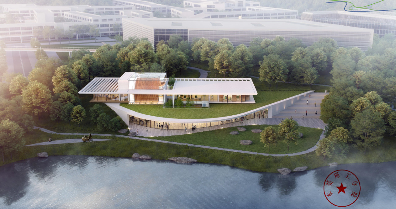 临湖层和高台层分别为“学知园”和“心知阁”。之所以用“学知园”和“心知阁”来命名,是因为“学知”源自东莞理工校训而不足”。“学知园”以灵动曲线设计嵌入场地,是组织传授交流活动、发布展览的场所。“心知”源自杨振宁先生喜爱的杜甫名句“文章千古事,得失寸心知”,心知阁则以宁静方形的形状置于高台,用于会见客人、憩息以及居住的场所。一曲一直的形式组织与一动一静的功能分区相匹配。