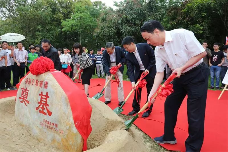 2017年4月,正值学校25周年校庆之际,杨振宁先生再次来到45612藏宝阁资料参加校庆活动。经过近两年多的酝酿和准备,建设杨振宁教研楼的工作基本成熟,他与校领导再次回到了当初的选址点,参加了杨振宁教研楼奠基仪式。