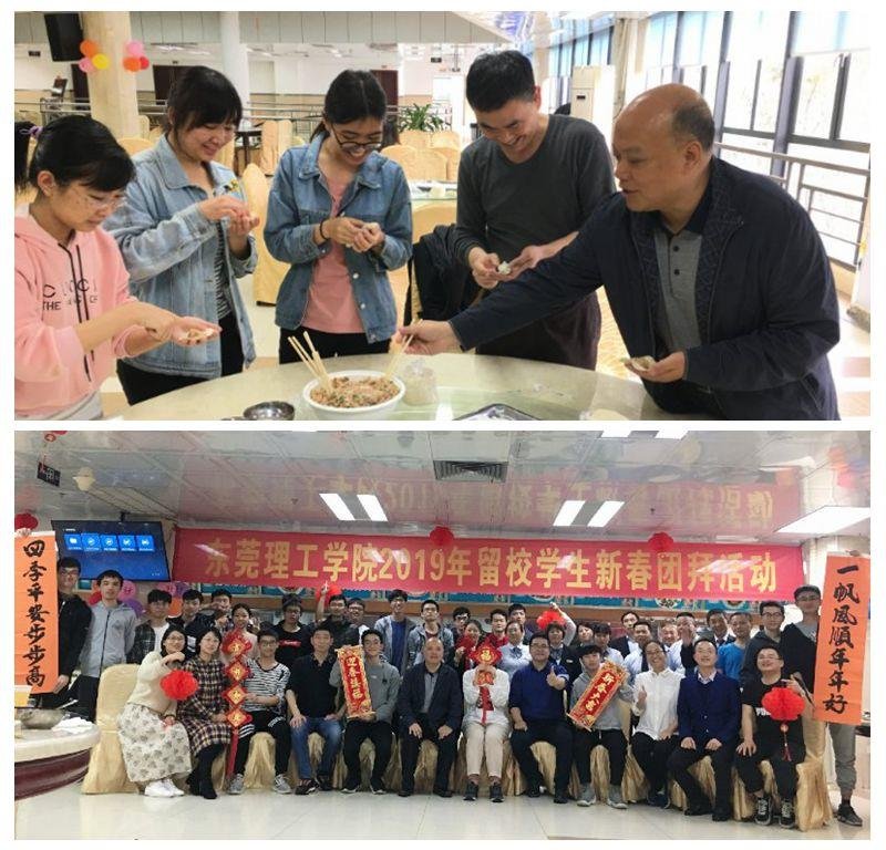 新春团拜活动上有包饺子,享美食,交流学习工作,用家乡话抒发对新年的祝福和畅想,最后师生齐声演唱《好日子》等迎春歌曲,现场充满欢声笑语,其乐融融。来自2017机械设计4班陈钦鸿同学说到“我与老师们共同动手包饺子,这是我生来第三次包饺子,却是第一次把饺子包好,这得益于在场老师们的指导,使我热切地感受到了在这新春之际,学校老师们对留校学生们的关心。”来自文传学院2016级杨晓莹因为考研而留校,她谈到“团年饭上老师们细心询问我的留校情况及复习进度情况,现场还举行了热闹的活动,让我有家的感觉。学校领导和老师们舍弃陪家人的机会和我们一起团聚,让我很感动。”环建学院2015级工程管理二班杨帆因为学习而留校,团年感受是“一个人在学校过年还有得吃好吃的,很好。”他希望学校能够继续坚持“以卓越的创新教育造福社会”,让莞工的学子以更开放的思维,更专业的能力为社会主义现代化做贡献。