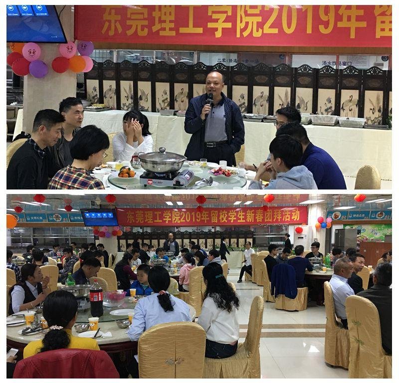 2019猪年新春佳节将至,2月3日腊月廿九,我校在松山湖校区第二食堂举行2019年留校学生新春团拜活动。校党委副书记吕琦元,党委学生工作部、校团委、后勤管理办公室、学生社区知行学院、二级学院负责人、辅导员及社工,与春节期间留校学生、在岗工作学校师生员工共100余人欢聚一堂,共度新春佳节。