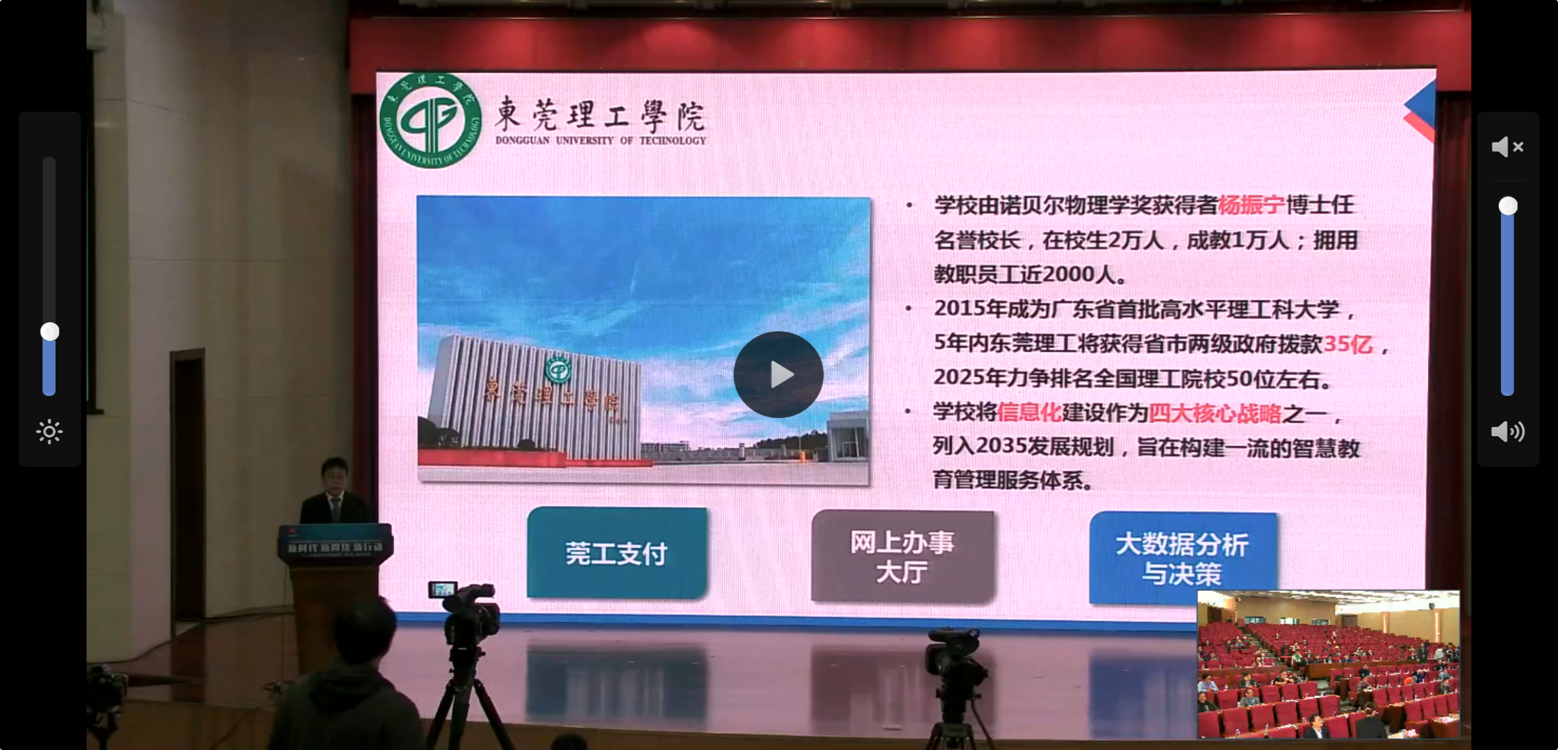 本次会议亮点纷呈。莞工会议直播、莞工会务信息化系统首次亮相。莞工会议直播的诞生,基本实现打破行政范围界限、地域时空界限,轻松召开视频会议的目标;莞工会务管理平台为学校带来了更高效的会务流程管理、更智能化的数据管理、更低的人力成本投入。
