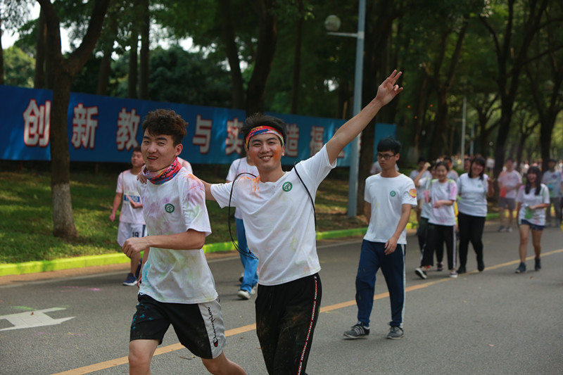 来自机械工程学院的孔同学,第一个抵达终点。原来纯白的T恤已被彩色的粉末渲染成一幅多彩的图案,甚至在睫毛处也铺着一层薄薄的粉末。但脸上的彩粉掩盖不住孔同学激动丰富的表情。“在坚持的过程中我获得了无与伦比的快感。”说到校庆,孔同学感怀,积极参与就是对学校最好的祝福。