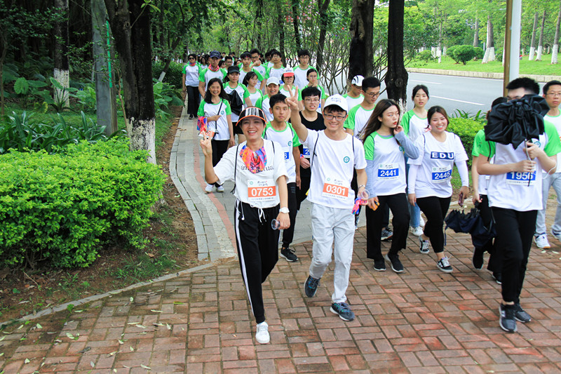 莞城校区的大行进队伍有序穿过体育场的各出口,以莞城校区各个地标为基本路线展开。一路上师生们谈笑风生,并依次在莞城校区四个站点顺利打卡。