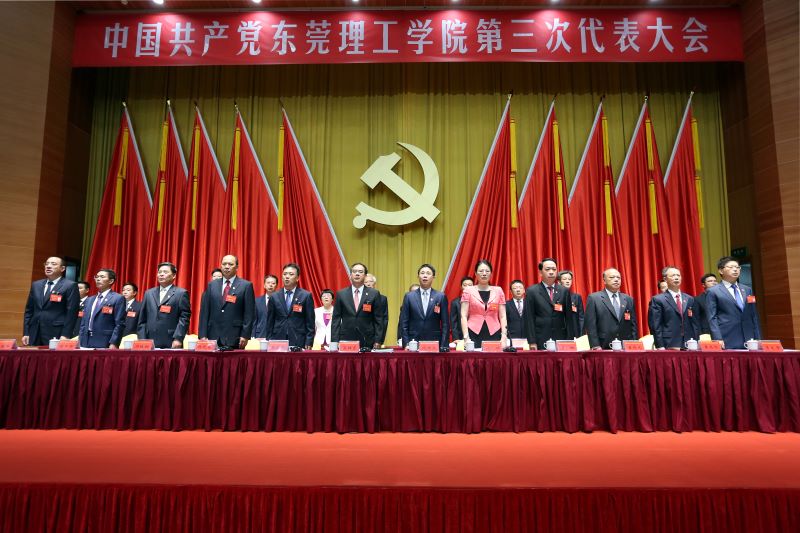 在主席台就坐的有东莞市委书记、市人大常委会主任梁维东,东莞市委常委、组织部部长郑琳,东莞市委常委、宣传部部长杨晓棠,大会主席团成员,学校学术委员会主任、党代表李琳,特邀嘉宾、学校老领导周致纳、张遐龄、钟剑辉、安少华,学校老领导、党代表黄碧莲。