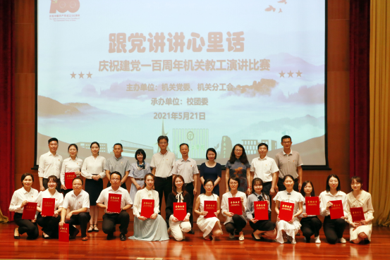 5月21日,由机关党委、机关分工会主办,校团委承办的庆祝建党100周年机关教工演讲比赛落下帷幕。来自机关十四个党支部的选手围绕“跟党讲讲心里话”主题,以生动感人的内容和饱满真挚的情感为机关教工带来了一场精彩的演讲。此次活动采用线上线下结合的形式进行,参与人数达246人。学校党委副书记李忠红同志出席了活动,并为一等奖获得者颁发了奖状。