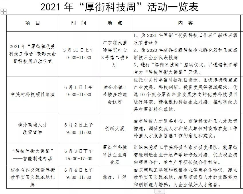 除此次活动外,本周内厚街还将举行中关村科技项目路演、“科技厚街大讲堂”之智能智造专场、校企合作交流暨高校实习实训基地挂牌等一系列活动,其中我校参与的活动超过半数,标志着厚街镇与我校的校地战略合作更加落到实处,双方将更加紧密而有力地共同推动科技创新提质发展。