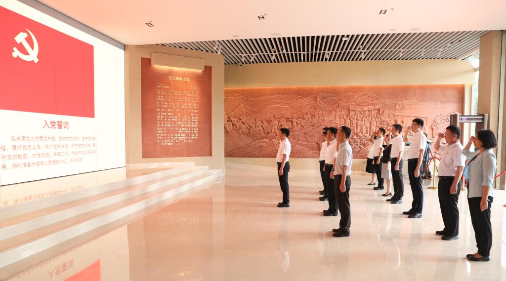 中心组一行首先前往广东东江纵队纪念馆开展现场学习。在东江纵队纪念馆内,大家聆听革命故事,瞻仰历史陈列,深入了解东江纵队武装抗日的艰难历程,共同缅怀革命先烈的崇高革命精神。随后,面向鲜红党旗,校党委书记成洪波带领全体成员重温入党誓词。铮铮誓言叩问着拳拳初心,倾诉着党员们对党的绝对忠诚和对共产主义事业的坚定信仰。