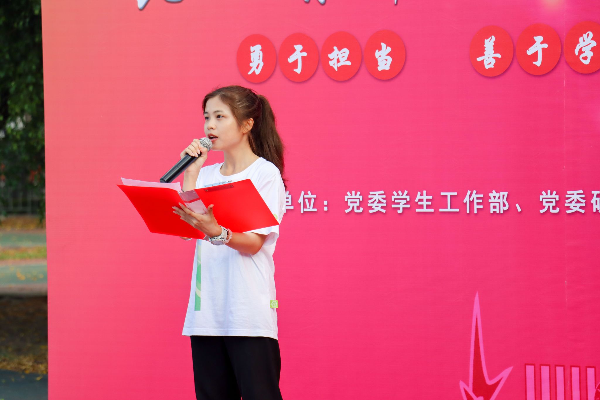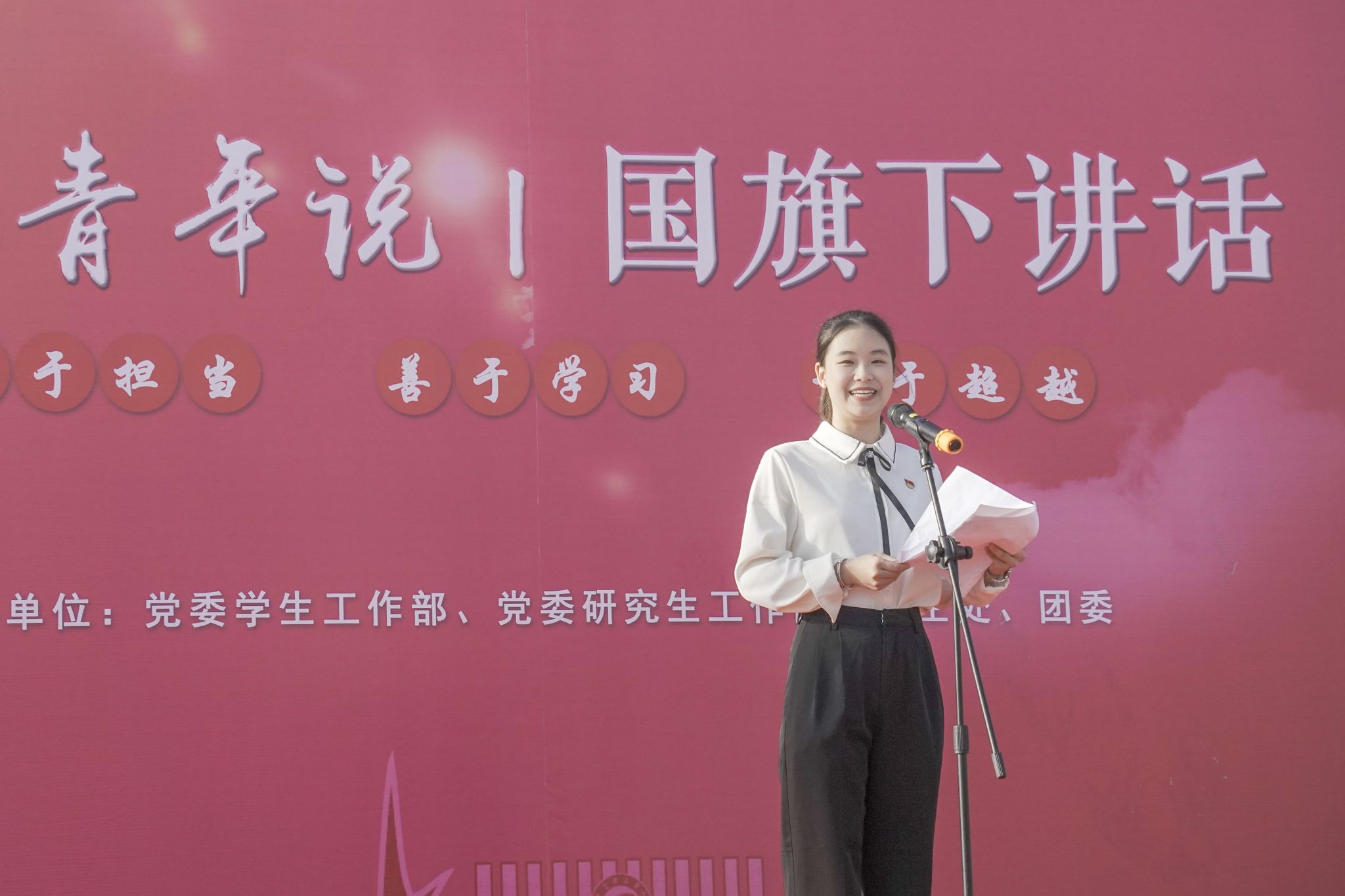 两位学生代表走上“莞工青年说”舞台,在国旗下和大家分享他们的爱国感言。