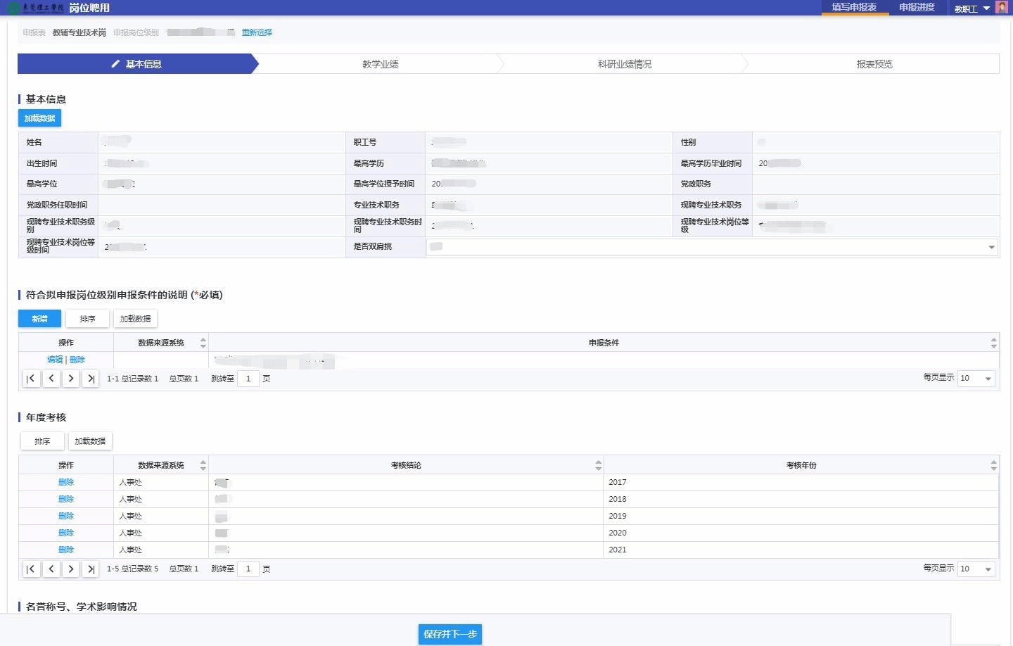 近日,学校正有序开展第三轮岗位设置和人员聘用工作。与往年不同,在学校网络安全与信息化办公室数据中台赋能之下,教职工无需线下录入大量申请表信息,只需要登录岗位聘用系统进行线上填报,系统自动填充教师个人的基本信息、年度考核、教学、科研等各类数据,大幅度减轻了教职工的填报工作量。此次填报工作进一步落实了“数据多跑路、老师少跑腿”,同时实现了在线流程化管理,从教师填报、二级组织机构审批与汇总、学校完成数据审核汇总统计,全流程实现线上办理。