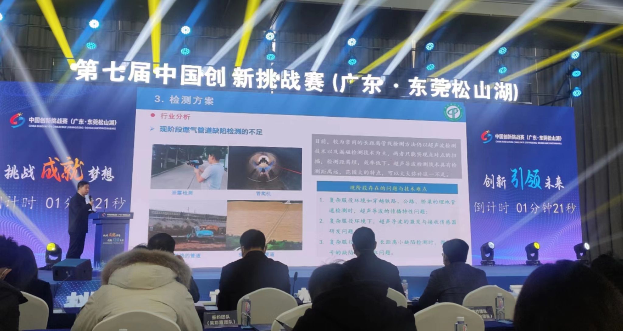 现场赛上,围绕东莞市常正管道燃气公司、广东中德电缆有限公司及东莞立讯技术有限公司三家企业所提出的技术需求,9位“挑战者”分为三组分别开展现场路演。专家评委结合“挑战者”的技术创新程度、技术先进性、方案可行性、技术成熟度等进行现场提问及评分。