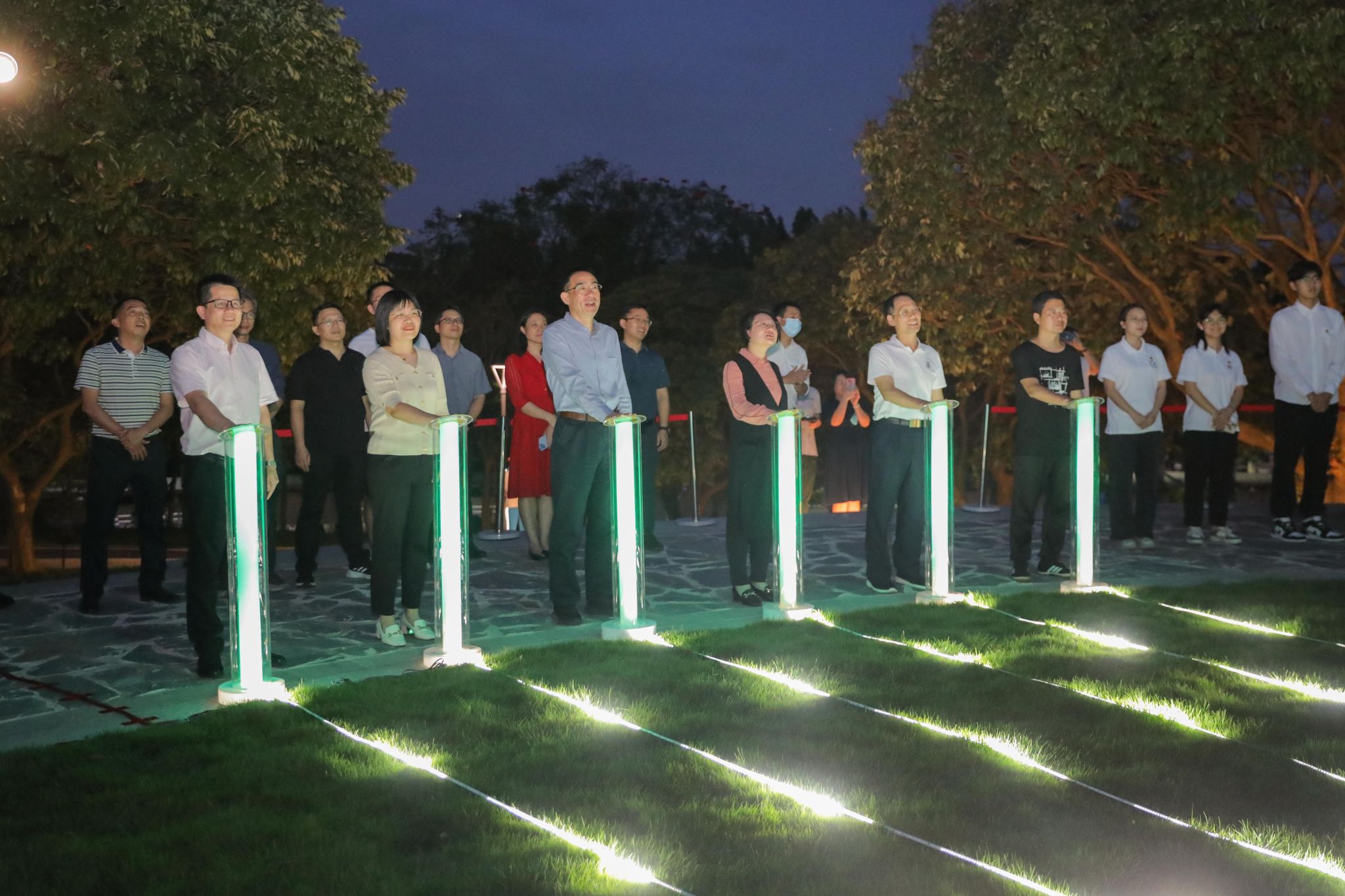 晚上7:00,科技树亮灯仪式在求真园举行。副校长杨敏林、相关职能部门负责人、教师代表等一起摁下亮灯按钮。亮光沿着灯柱缓慢流向科技树将其点亮。夜空中显示出莞工校徽元素,科技动感、夺目亮眼。现场师生们共同见证着科技树闪耀莞工,吸引着师生们打卡拍照。
