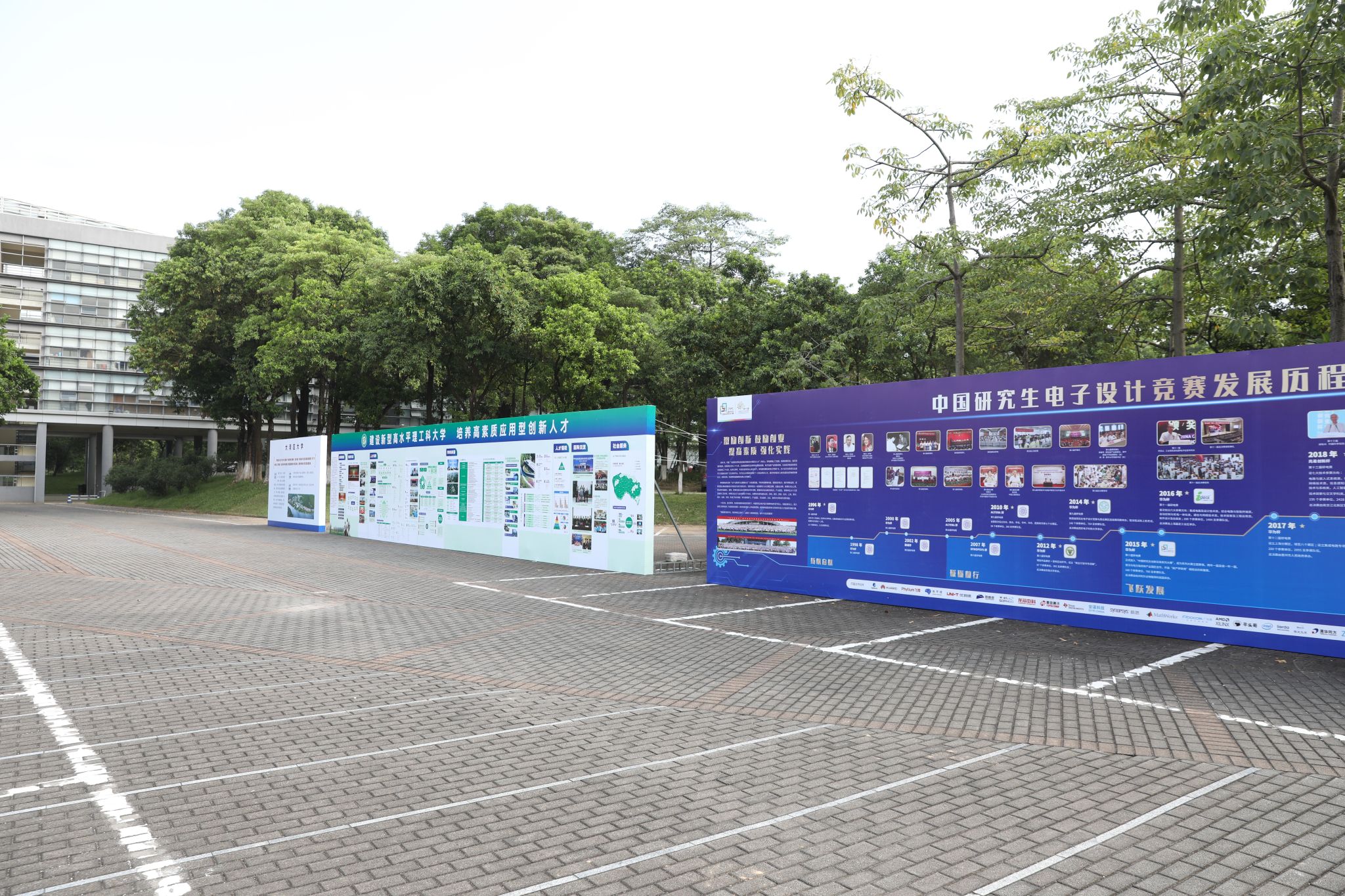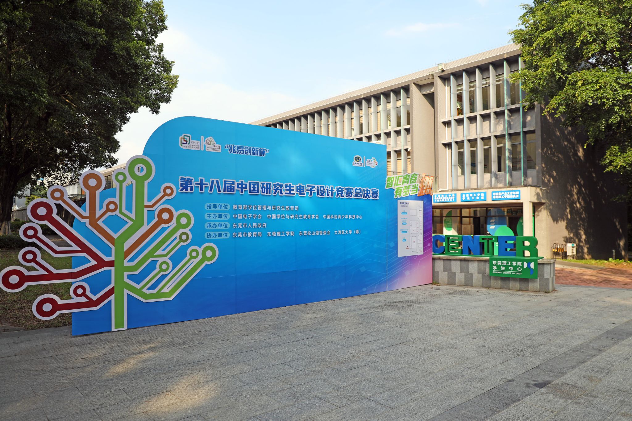 赛事即将拉开大幕,莞工校园里赛事氛围十足。走在校道上可以看见赤红的横幅,传达着莞工对全体参赛师生的欢迎之情。明快醒目的比赛标语牌展现着朝气与活力,也向参赛选手输送鼓励与力量。在学生中心、学生社区及礼堂外放置了多个让人眼前一亮的大型宣传栏,展示研电赛的发展历程、东莞的城市特色以及学校的育人成绩和办学成果。