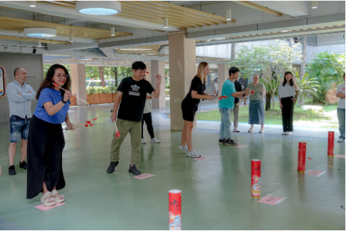 在游戏环节,留学生们与汤加代表团现场体验了投壶这项中国传统技艺,身体前倾、瞄准壶口,投中啦!现场趣味满满,欢乐笑声此起彼伏。