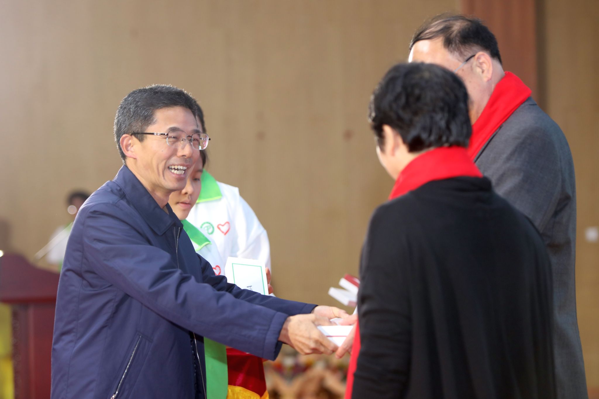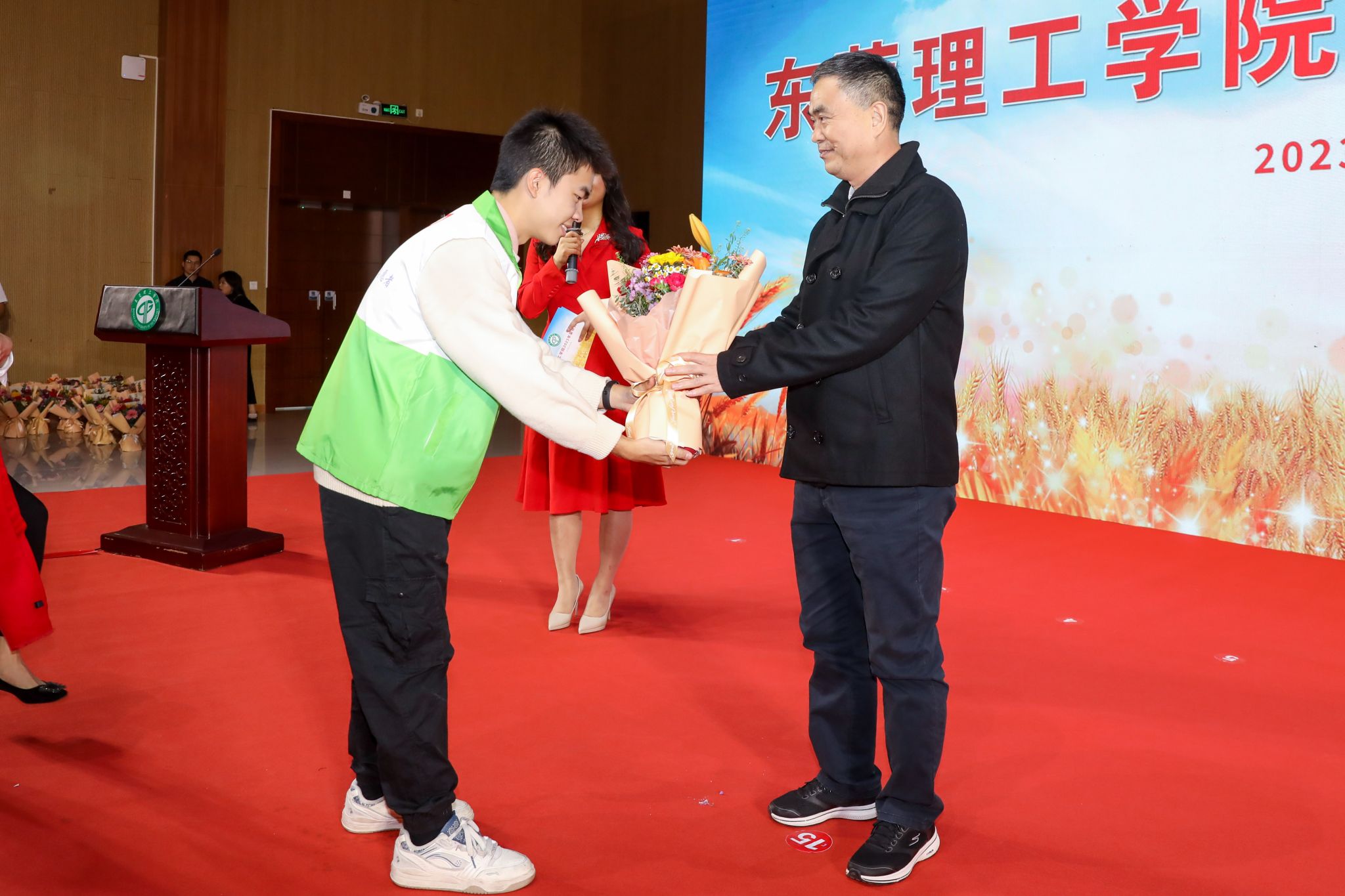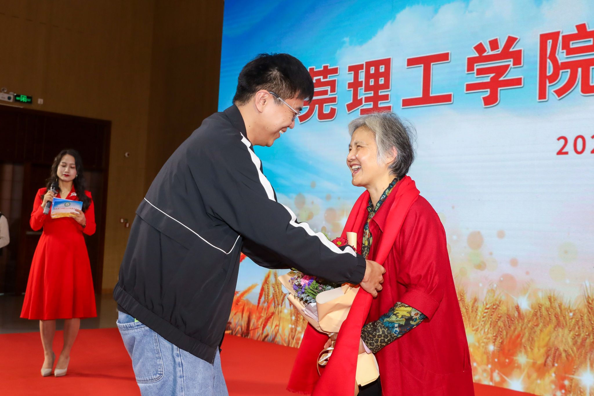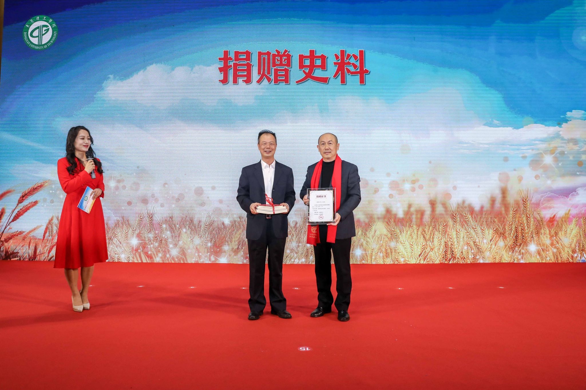 伴着悠扬的旋律,在全场师生的注目下,荣休教职工走过红毯,来到舞台中央。学生代表献上鲜花,青年教职工为荣休教职工戴上红围巾。一束鲜花,代表了莞工师生深深的谢意和无限的敬意;一条红围巾,象征为党育人、为国育才的初心使命在一代代教育者之间传承。