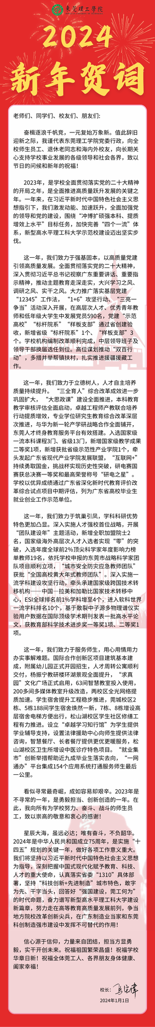 星辰大海,虽远必达;唯有奋斗,不负韶华。2024年是中华人民共和国成立75周年,是实施“十四五”规划的关键一年,做好各项工作意义重大。我们将坚持以习近平新时代中国特色社会主义思想为指导,深刻把握中国式现代化赋予教育、科技、人才的重大使命,认真落实省委“1310”具体部署,坚持“科技创新+先进制造”城市特色,敢字为先、干字当头,回答好“强国建设,莞工何为”的时代命题,奋力谱写新型高水平理工科大学建设新篇章,努力走在高等教育高质量发展前列,争当地方院校改革创新尖兵,在广东制造业当家和东莞科创制造强市建设中发挥不可替代的作用!