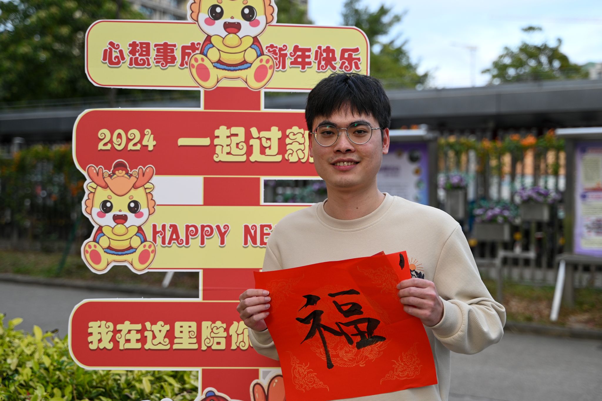 在莞香传习所里,师生围坐在一起,手持针线、剪刀,认认真真、仔仔细细地做香包挂饰、剪龙年窗花。房间的另一侧,老师和同学们在红纸上挥毫泼墨,一笔一划写下“福”字。室外,大家或排队参加投壶、糖画龙、红包许愿、新年拼图等小活动,或拿着自己制作的手工艺品、糖画、红包合影留念,新春氛围满满。