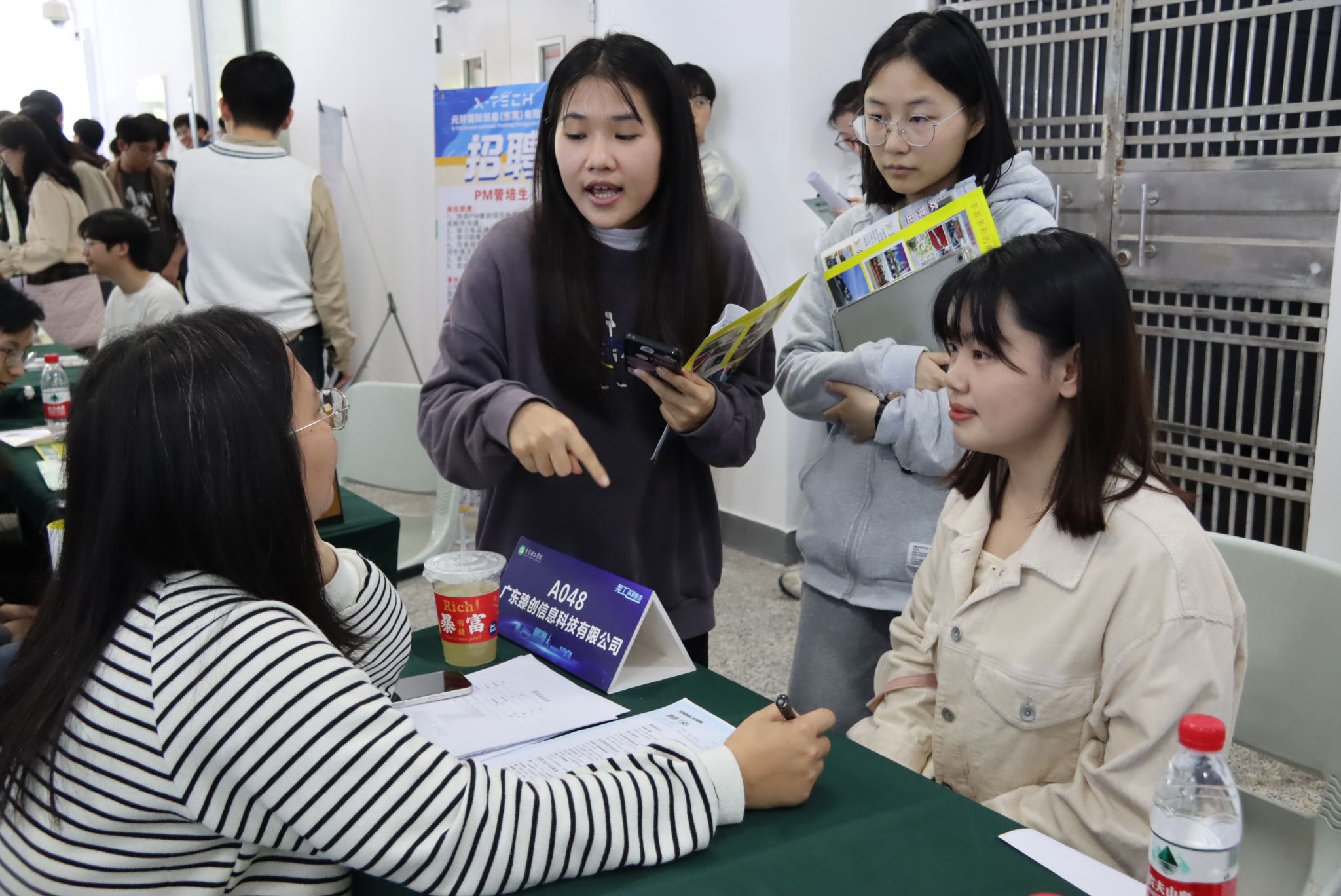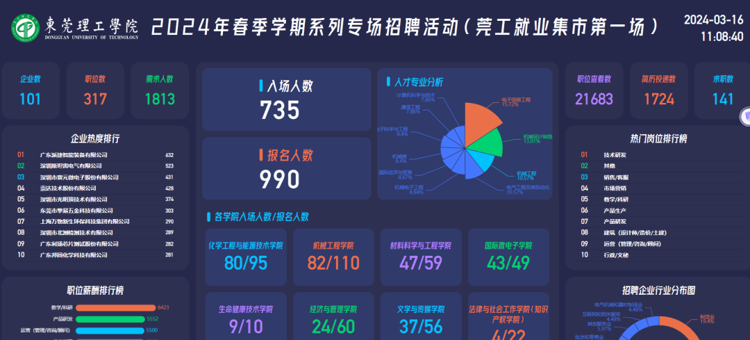 3月14日下午,我校2024年春季学期系列专场招聘活动(莞工就业集市第一场)在松山湖校区举行。本次招聘活动以“就业集市长廊”形式展开,线上线下参会企业101家,岗位需求超1800个,吸引了近700多名同学到场应聘,投递简历超1700份。