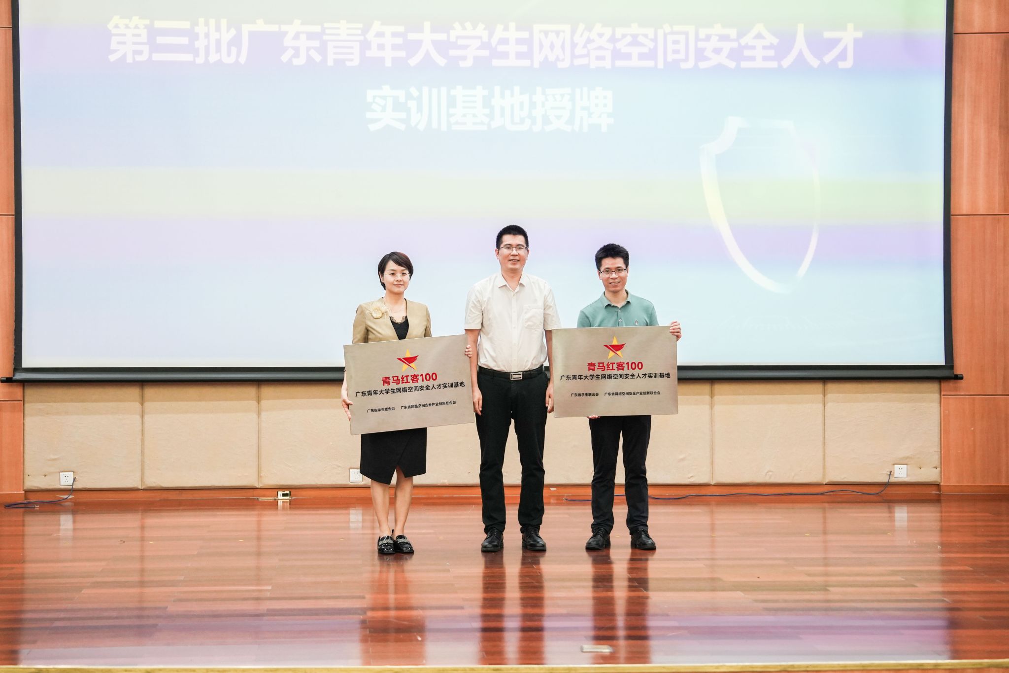 会上举行第三批广东青年大学生网络空间安全人才实训基地授牌仪式,朱瑞峰为广州锦行网络科技有限公司和广州方禾数据有限公司授牌。