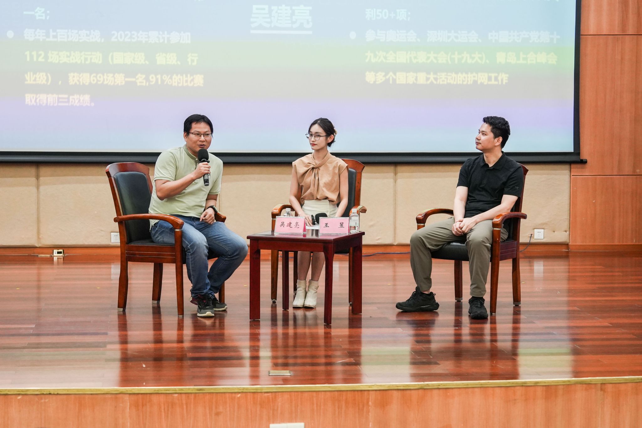 闭幕式还举行了网络空间安全发展论坛,网络空间安全领军人才、长亭科技有限公司技术副总裁王昱为选手们分享工作经历、成功经验和技术见解。同时,特别设置“网安大咖面对面”环节,邀请王昱与广州锦行网络科技有限公司首席技术官吴建亮一同和观众师生面对面深入讨论网络安全发展形势和对人才培养的要求。