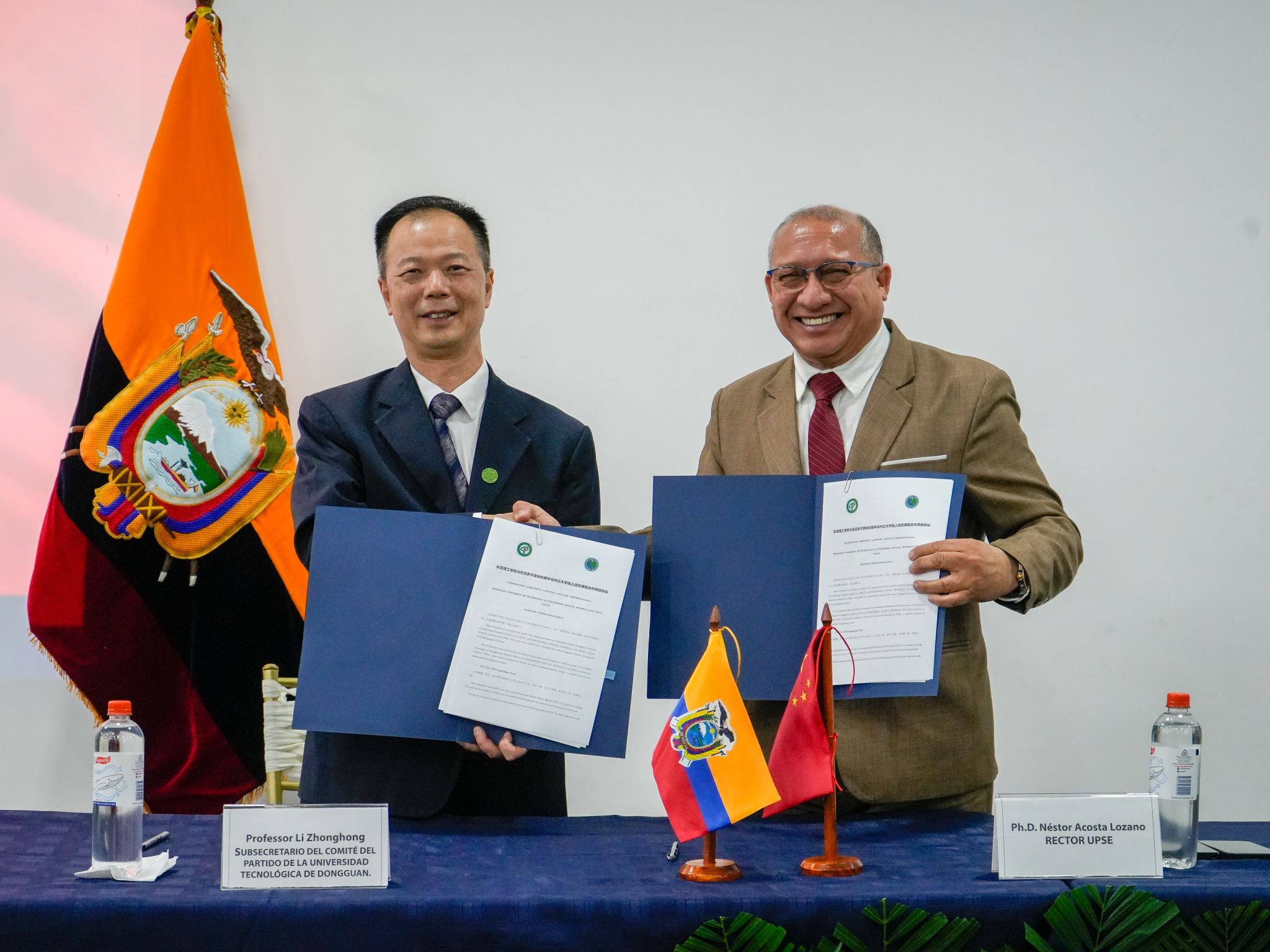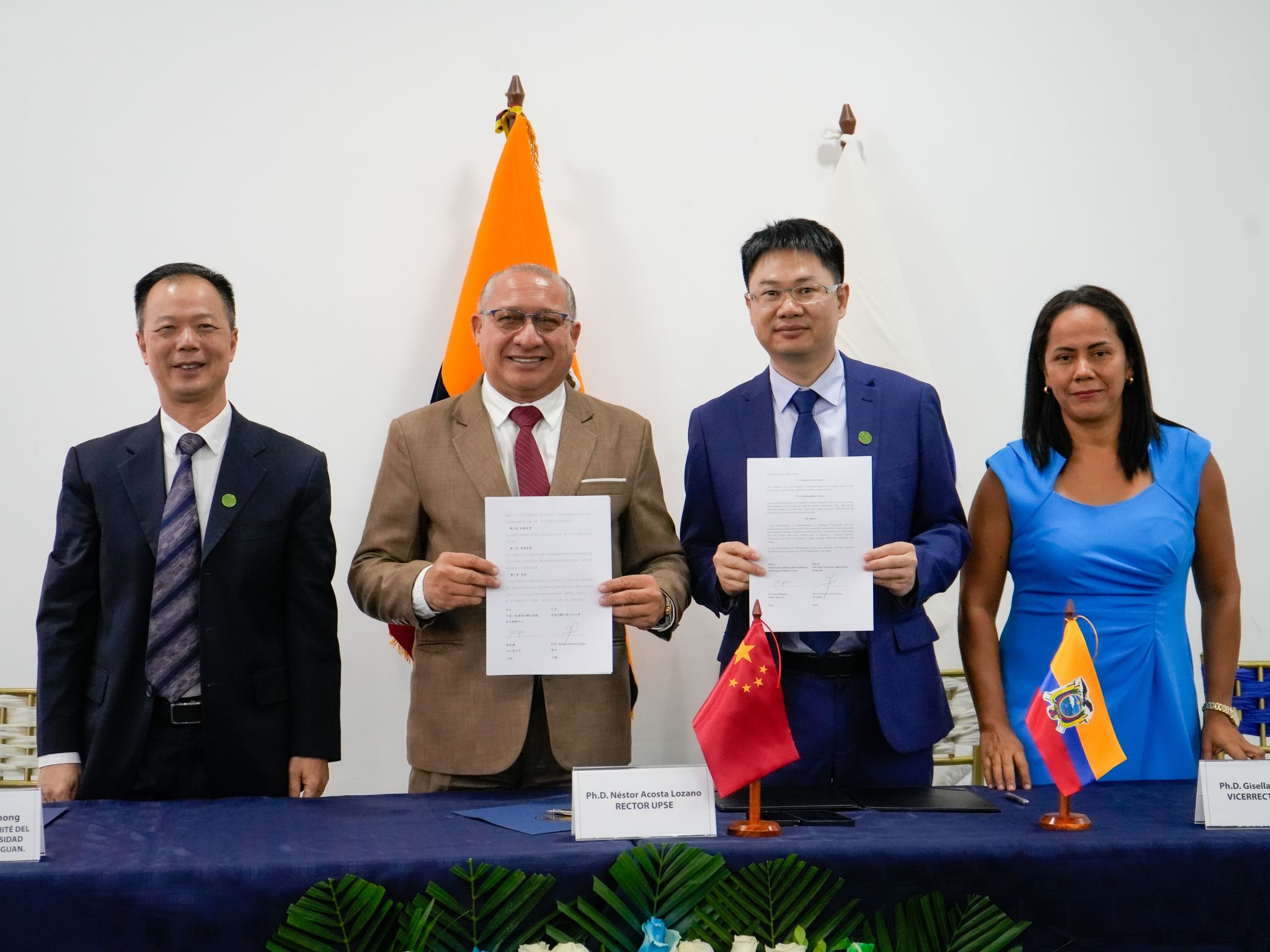 在厄瓜多尔访问期间,出访团组访问了UPSE大学,与该校校长内斯托尔·阿科斯塔·洛扎诺(Néstor Acosta Lozano)、副校长吉塞拉·保拉·奇卡(Gisella Paula Chica),以及对外关系部、工程科学学院、系统与电信学院、科学技术研究所、公共企业部等负责人进行了座谈。双方围绕人才联合培养、语言课程互换、教师学术交流互访、学生交流交换等项目进行了深入交流,并签署了两校线上语言课程合作项目协议。我校将依托国际学院与该校通过线上混合式语言课程(汉语与西班牙语)的对等互换,为两校学生提供免费语言课程班服务,加强我校与海外高校之间的语言文化交流,并将以此为蓝本在未来推动我校优质校本课程“走出去”以及国际化优质课程“引进来”。同时,我校作为中国—拉美和加勒比国家技术转移中心(以下简称“中拉技术转移中心”)实体运营机构的理事长单位,推动及见证了中拉技术转移中心与该校签署合作意向书,双方将聚焦于提高海洋资源开发利用,应用技术创新推进海洋产业升级,促进两地企业、技术、人才相互交流。