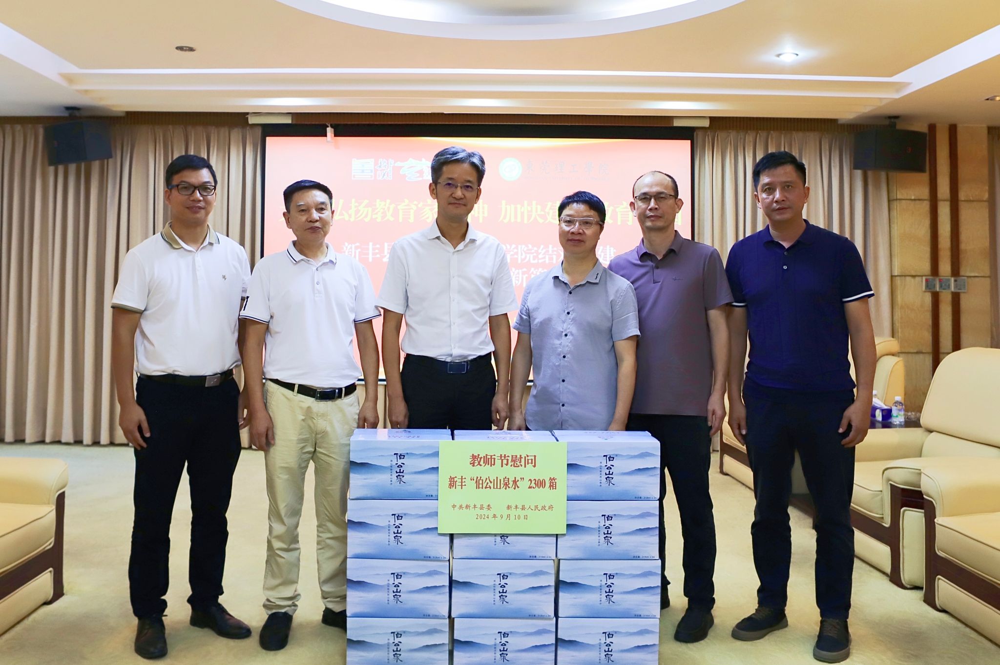 9月10日下午,我校“双百行动”结对县韶关市新丰县还以县委、县政府名义给学校发来感谢信,并送来2300箱本地生产的伯公山泉水慰问全体教职工。