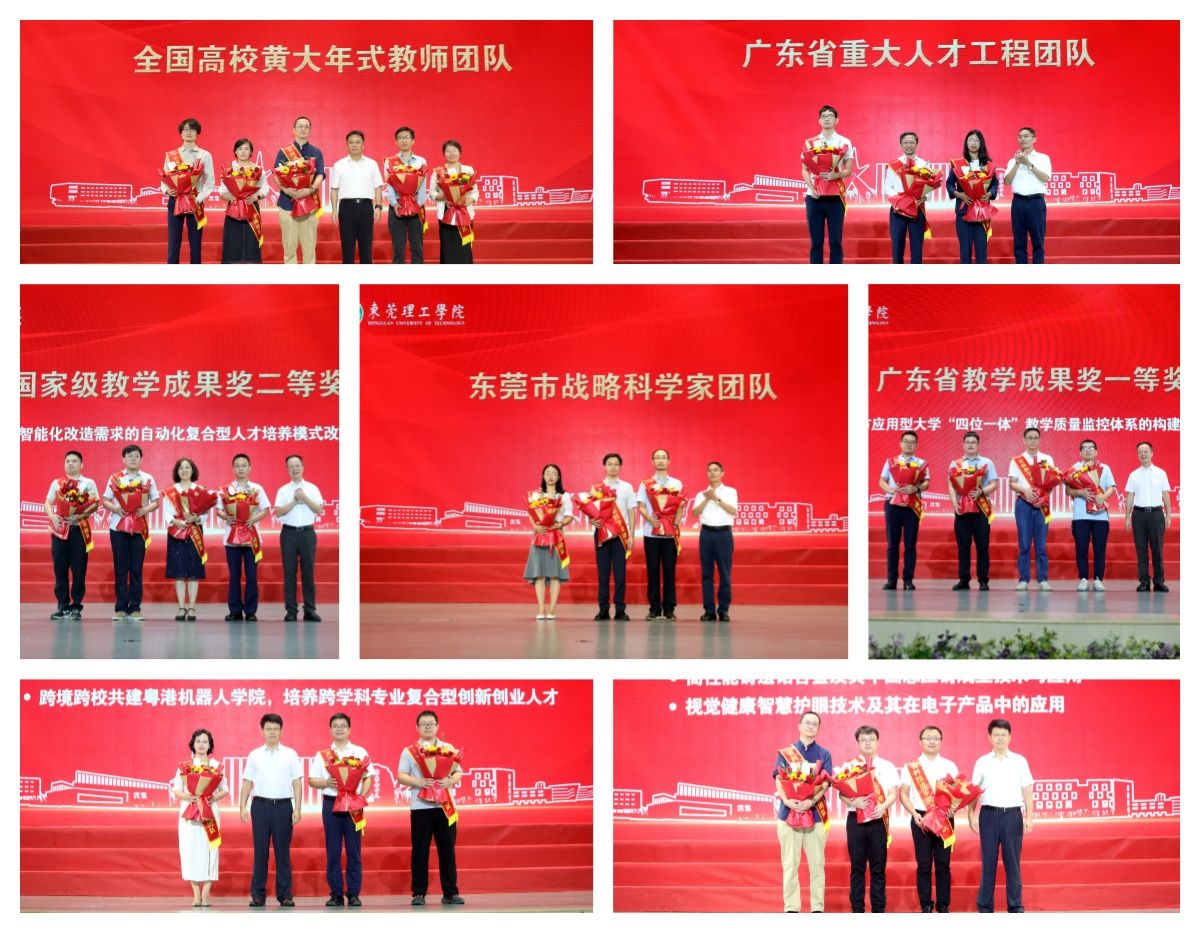 大会对学校近年来在科研、教学等领域获得国家级、省级奖项的教师团队进行了表彰。校领导为全国高校黄大年式教师团队、广东省重大人才工程团队、东莞市战略科学家团队,国家级、省级教学成果奖以及省科技进步奖获奖团队代表赠花。