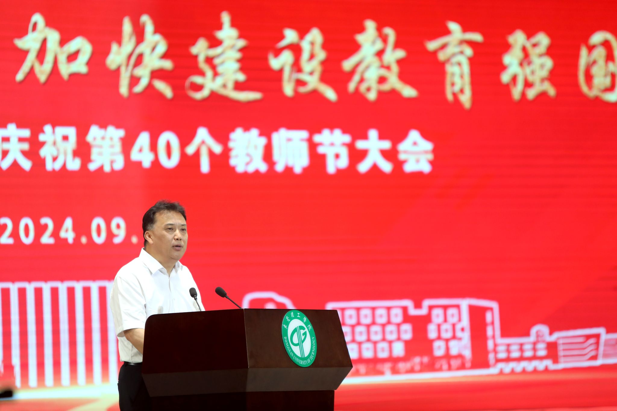 9月10日上午,学校在松山湖校区礼堂召开庆祝第40个教师节大会,庆贺节日,表彰先进,并举行新进教职工入职礼。本次大会以“大力弘扬教育家精神,加快建设教育强国”为主题,校领导、中层干部及教职员工代表参加本次活动。