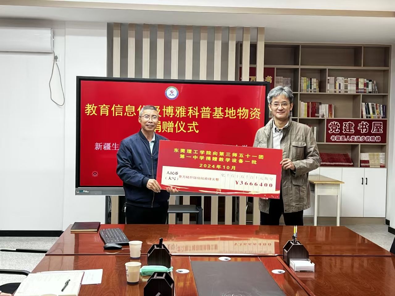 我校向第三师五十一团第一中学捐赠了一批教育信息化及博雅科普教育基地物资。并在四十四团第二中学举行了45612藏宝阁资料大学生思想政治教育暨实习支教基地揭牌仪式。共建基地将有助于校地双方聚焦立德树人根本任务,挖掘各自优势资源,密切协作、相互支持,为大学生提供厚植爱国情怀、投身边疆教育事业的“第二课堂”,促进校地之间共建共育共赢。