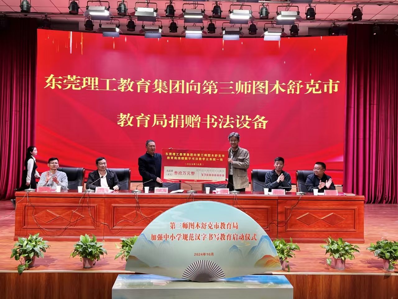 10月25日下午,调研组参与了图木舒克市教育局在五十三团第二中学举办的加强中小学规范汉字书写教育启动仪式。彭晓波代表东莞理工教育集团向第三师图木舒克市教育局捐赠总价值30万元的数字书法教学云系统,帮助中小学进一步加强小学规范汉字书写教育,发挥其独特育人功能,坚定文化自信,提升中小学国家通用语言文字教育教学信息化水平。