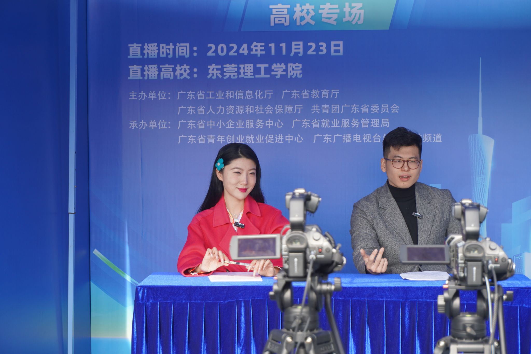 招聘会现场增设的直播带岗助“六稳”活动为招聘会带来了新的活力,共吸引了20余家企业的招聘负责人走进直播间,与广东广播电视台的专业主持人一起,通过广东经视、21财经、今日头条、微信视频号等平台,向广大毕业生及求职者推送就业岗位、招聘需求、薪资待遇等信息,实现求职者与企业线上精准匹配,线下高效对接。