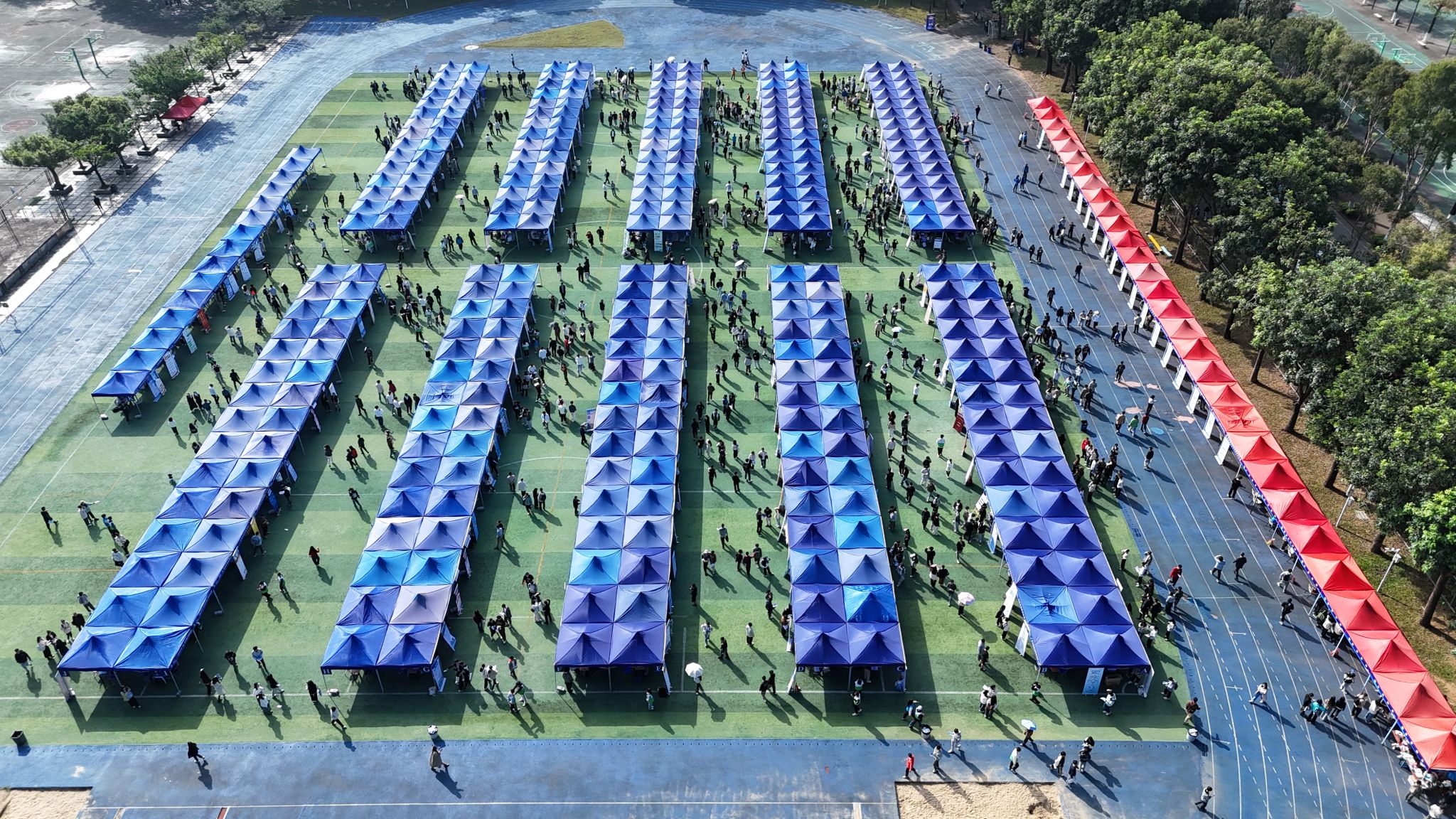 上午9:00,松山湖校区假草田径场人声鼎沸。蓝色帐篷井然有序排列,企业招牌色彩斑斓,展位与桌椅摆放整整齐齐。求职者手握简历,眼神中透露紧张和期待,他们或是热情与同伴聊天,或是冷静观望。