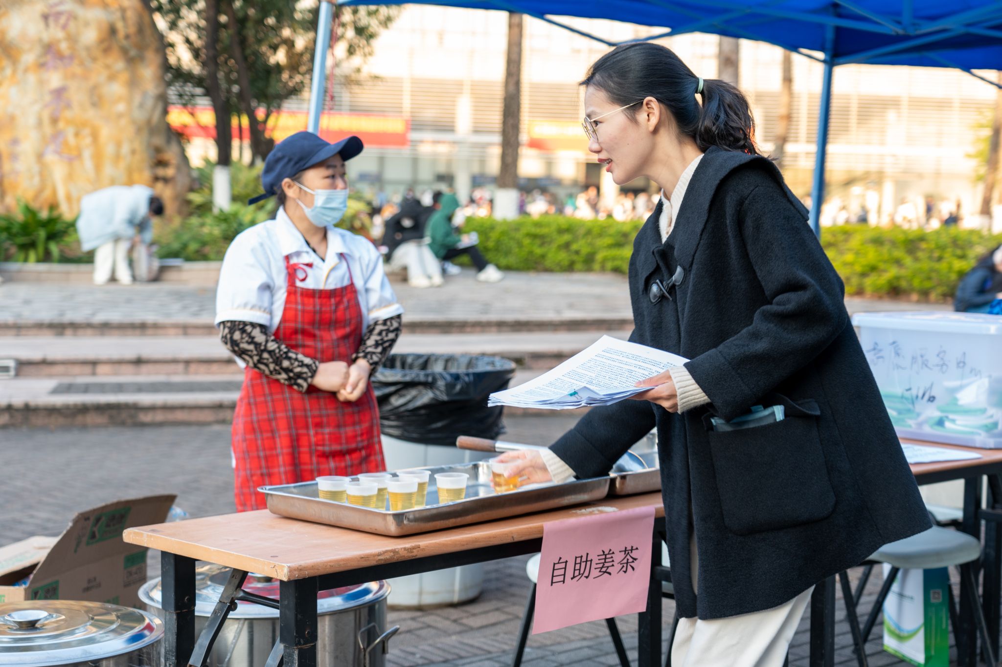 学校在考场外设置了总咨询处、大学生活超市服务点、医疗服务点等,尽力满足考生在考试期间的各种需求。考虑到早晨天气寒冷,食堂工作人员更是精心熬制了热气腾腾、暖心暖胃的姜茶热饮,供现场师生免费饮用,为考研学子送上暖暖的祝福鼓励,为现场工作人员加油打气。考点现场为忘记携带或遗失准考证的考生,设立了“临时打印服务点”,方便考生及时补打准考证,并安排校内电瓶车在校门口接送将近迟到的考生到考场。