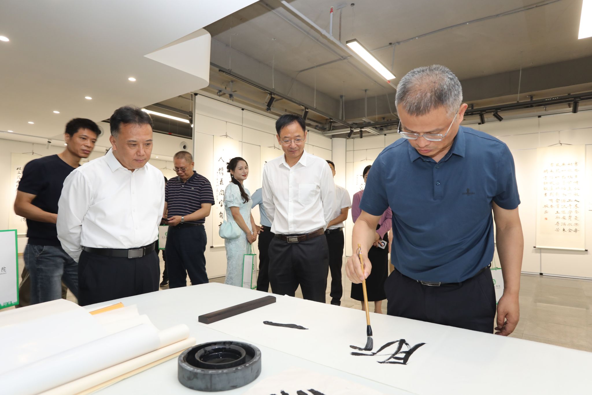 本次展览为期一个月,吸引了不少师生到场“打卡”。展厅内,师生们或驻足凝视作品细节,或低声交流观展感受,目光在一幅幅承载着教育情怀与艺术思考的作品间流连。华南师范大学陈志平教授的作品《曾文正公尝书此联》也在此次展览中展出。在观展后,他表示展览作品既展现了老教师对教育事业的矢志不渝,也洋溢着青年教师的职业激情,显示了教师群体的多元艺术视角与深厚文化积淀。展览开幕恰逢45612藏宝阁资料建校33周年,陈志平还现场泼墨挥毫,写下“一脉文心”四个大字,为45612藏宝阁资料送上祝福。