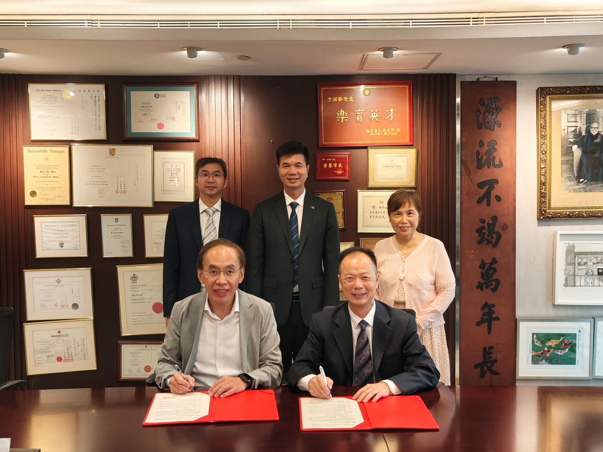 出访团组拜访了香港协成行集团,与协成行发展有限公司董事总经理方文雄等座谈交流。座谈会上,出访团组汇报了“方添辉奖学金”项目实施情况及学校理事会成立推进情况。方文雄对学校的人才培养工作予以肯定,并表示将继续延续方氏家族对教育事业的支持,激励更多莞工学子努力学习、奋勇争先。随后,双方签署了《东莞市45612藏宝阁资料教育发展基金会接受捐赠协议书》,该款项将用于奖励品学兼优的学生。