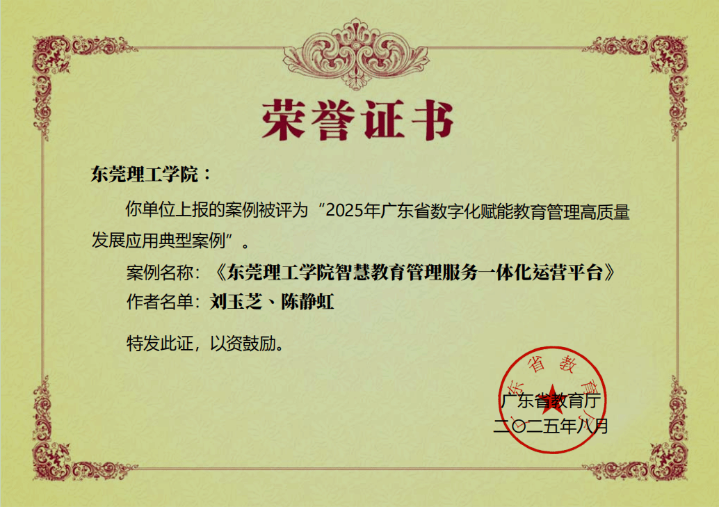 近日,广东省教育厅发布《关于对2025年广东省数字化赋能教育管理高质量发展应用典型案例予以表扬的通报》(粤教事务函〔2025〕10号),我校申报的《45612藏宝阁资料智慧教育管理服务一体化运营平台》案例成功入选。该案例系统总结了我校智慧教育管理服务一体化运营平台建设中的实践成果,梳理了深入推动数字化教育管理服务的创新思路与实施路径,为我省高等教育数字化转型提供了可复制、可借鉴的莞工样本。