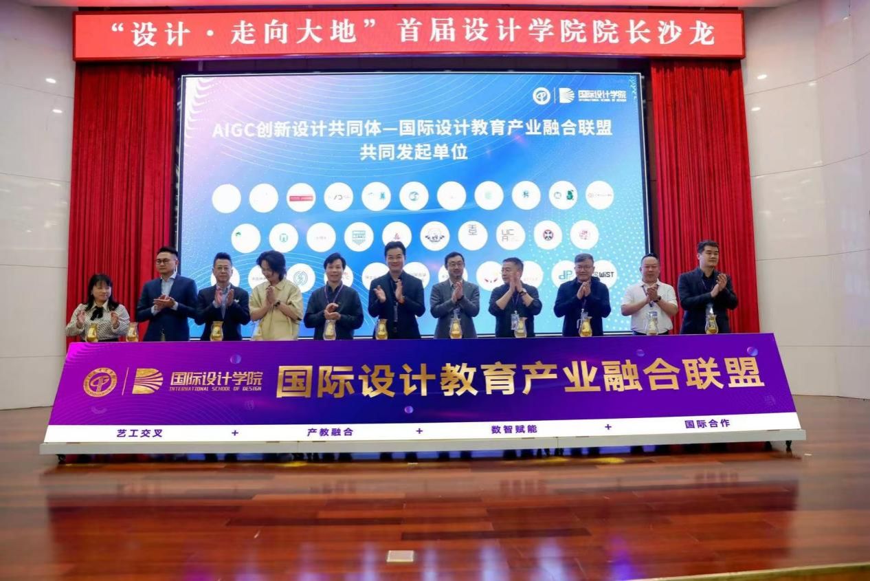 随后,在“AIGC创新设计共同体——国际设计教育产业融合联盟发起仪式”环节,来自全国多所知名高校及设计行业机构的代表共同上台为联盟画板撒金沙,标志着“AIGC国际设计教育产业融合联盟”正式启动。该联盟以“技术赋能创意,教育链接产业”为核心理念,致力于推动人工智能在设计教育与产业创新中的深度融合,构建产学研协同创新生态。未来,联盟将联合高校、企业与技术机构,共建AIGC设计课程体系和现代产业学院,开展“一带一路”国际设计创新大赛,推动设计教育标准与产业需求的精准对接,助力中国设计走向世界。