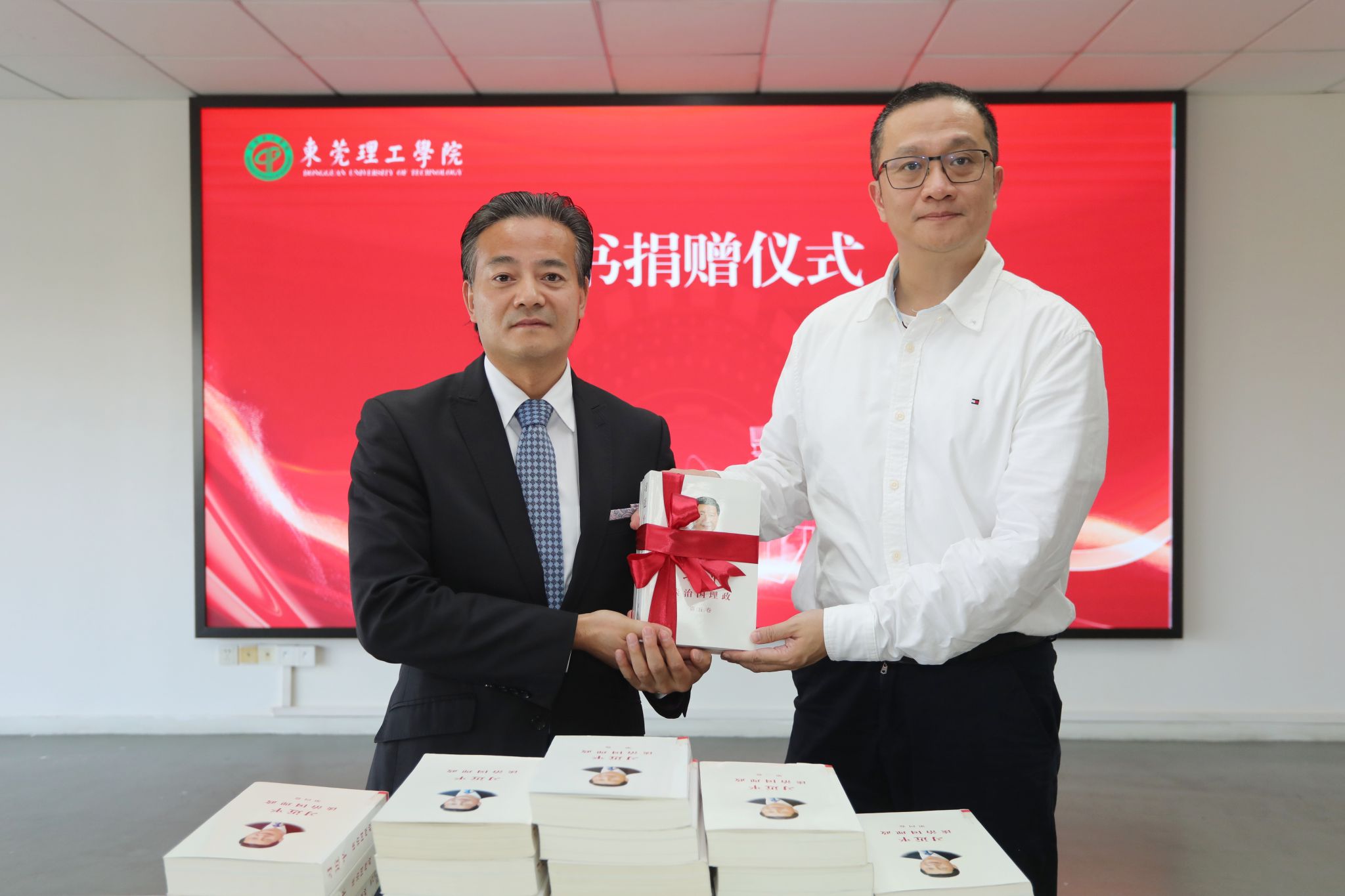 12月11日下午,《习近平谈治国理政》多语种书籍捐赠仪式在我校松山湖校区图书馆举行。北京崇学文化发展有限公司向学校图书馆捐赠《习近平谈治国理政》多语种图书365册,副校长郑愚代表学校接受捐赠。校党委副书记、校长马宏伟代表学校向北京崇学文化发展有限公司负责人余富文颁发捐赠证书。校领导赖日辉、李忠红、徐勇军和相关职能部门负责人参加仪式。校党委副书记李忠红主持仪式。