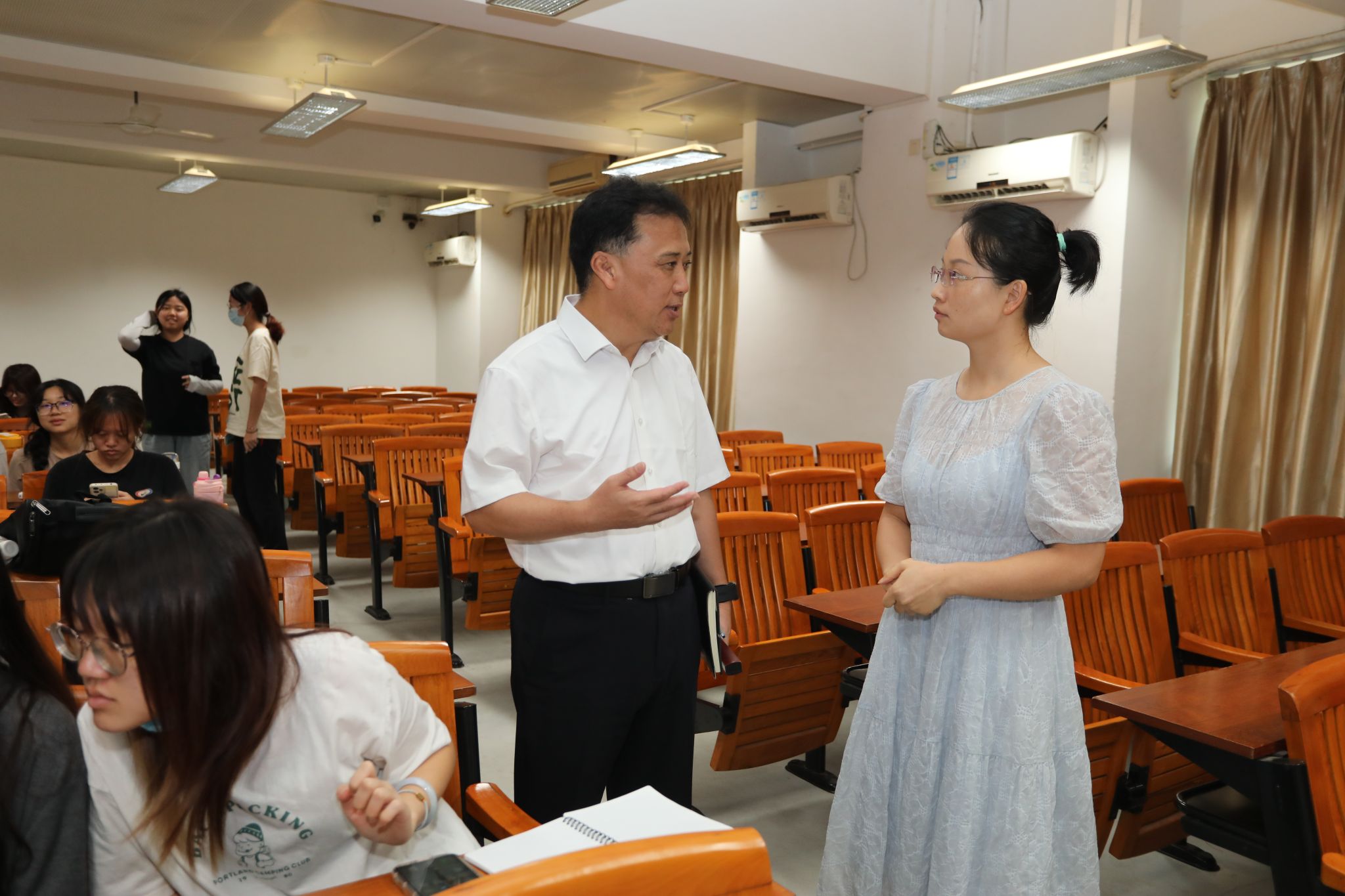 9月11日上午,校党委副书记、校长马宏伟来到教学楼,走进马克思主义学院青年教师张洁的课堂,和同学们一起认真聆听学习了《导论·马克思主义中国化时代化的历史进程与理论成果》这一章节的内容。在听课中,马宏伟细致作了笔记,记下了授课内容。课后,马宏伟与张洁老师作了交流,对课堂教学效果给予了肯定。作为从教将近四十年的老教师,马宏伟对张洁老师的授课技巧作了指导。他建议,要进一步完善改进教学设计,要充分开展师生互动讨论,优化授课方法,提高教学效果,引发学生情感共鸣,增强思政课的说服力和吸引力。当天,马宏伟还到马克思主义学院教师马冀群的课堂上听课交流。