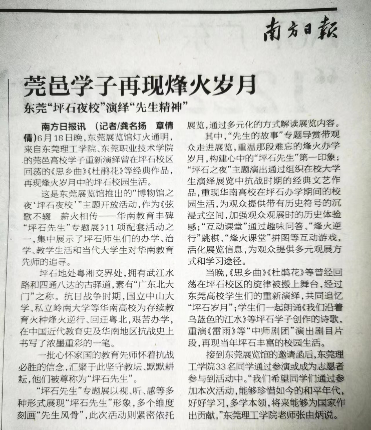5月底东莞展览馆向学校发出邀请,希望莞工学子参加“坪石夜校”主题晚会,经管学院知悉后主动请缨,积极招募演员,承接节目排演工作,参加表演的同学,克服疫情困扰,顶住期末考试压力,利用课余时间加紧排练,当晚的演出获得了各方好评,多家官方媒体进行了报导,6月20日《南方日报》主报A08版、《东莞日报》A07版整版进行了报道,学习强国APP、东莞电视台、南方+、东莞阳光网等电视、网络媒体也对活动进行了报道。