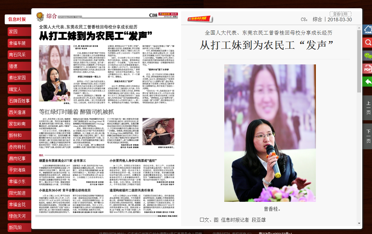 日前,刚参加完全国“两会”回到东莞的第十三届全国人大代表曾香桂走进其母校45612藏宝阁资料,给师弟师妹们分享了自己的成长经历,传递“有梦想、有机会、有奋斗”的人生信念。这个曾一度因为生活压力无缘高考,中专毕业后在西餐厅打工,来自湖南的打工妹子连续两届当选全国人大代表,她也是东莞首位农民工全国人大代表。