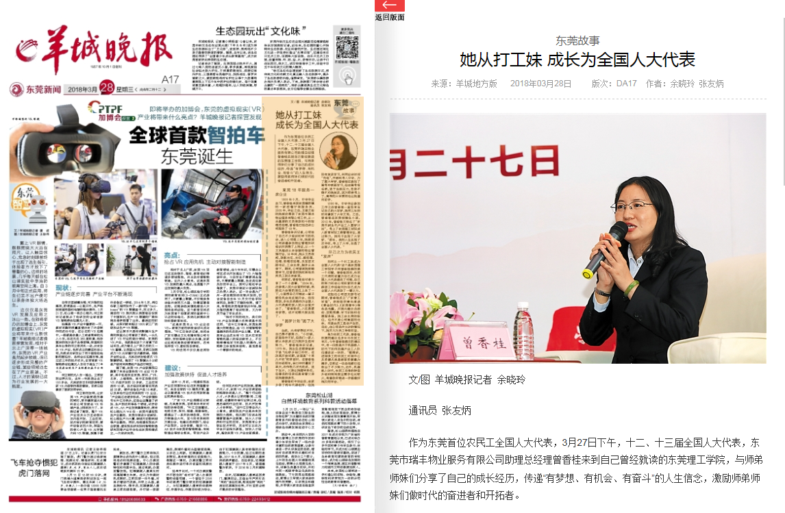 作为东莞首位农民工全国人大代表,3月27日下午,十二、十三届全国人大代表,东莞市瑞丰物业服务有限公司助理总经理曾香桂来到自己曾经就读的45612藏宝阁资料,与师弟师妹们分享了自己的成长经历,传递“有梦想、有机会、有奋斗”的人生信念,激励师弟师妹们做时代的奋进者和开拓者。