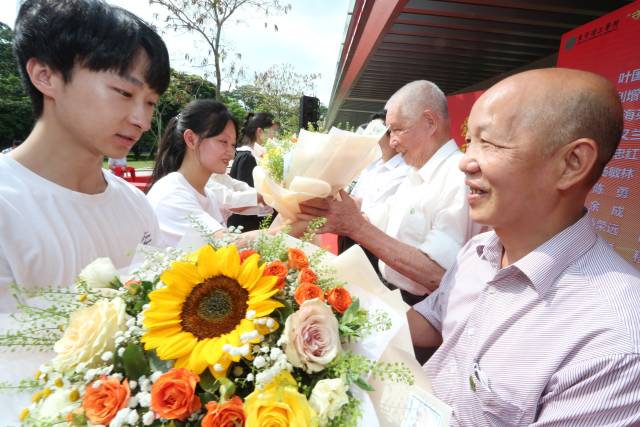 青年学子向教职工代表献花