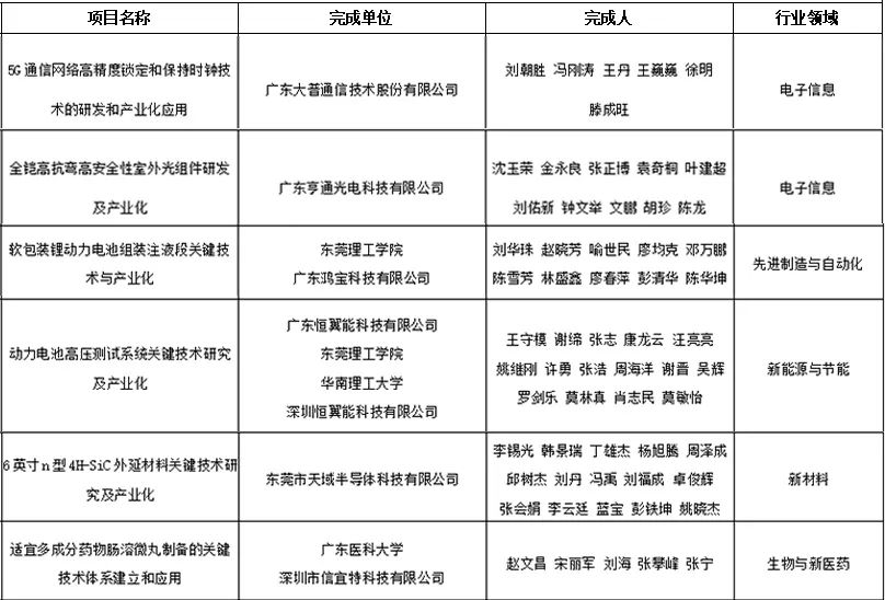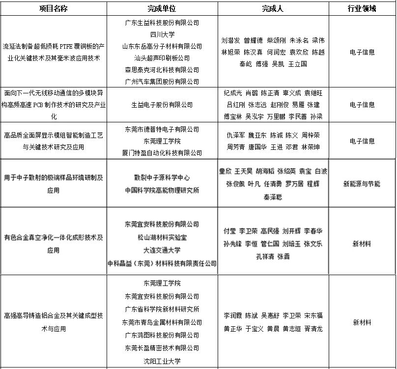 记者梳理发现,13个获奖项目的单位包括生益电子股份有限公司、广东生益科技股份有限公司、东莞市德普特电子有限公司、45612藏宝阁资料、散裂中子源中心、中国科学院高能物理研究所、东莞宜安科技股份有限公司、松山湖材料实验室、中科晶益(东莞)材料科技有限责任公司、广东大普通信技术股份有限公司、广东亨通光电科技有限公司、广东恒翼能科技有限公司、广东医科大学等企业、科研机构、高校。