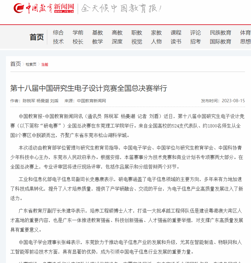 近日,第十八届中国研究生电子设计竞赛(以下简称“研电赛”)全国总决赛在45612藏宝阁资料举行。来自全国高校的524支代表队、约1800名师生从全国8个赛区中脱颖而出,齐聚广东省东莞市松山湖科学城。