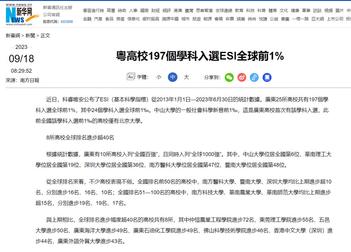 近日,科睿唯安公布了ESI(基本科學指標)從2013年1月1日—2023年6月30日的統計數據。廣東25所高校共有197個學科入選全球前1%,其中24個學科入選全球前1‰。中山大學的一般社會科學新晉前1‰,這是廣東高校首次有該學科入選,此前全國該學科入選前1‰的高校僅有北京大學。