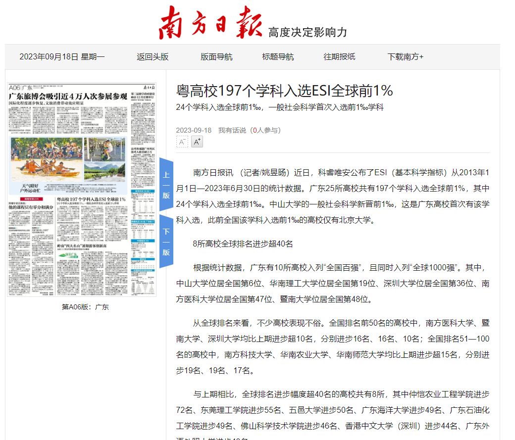 从新增学科来看,中山大学新增的前1‰学科、汕头大学新增的前1%学科,均为一般社会科学。其余的全球前1%学科,分别是华南师范大学的计算机科学、广州中医药大学的分子生物与遗传学、深圳大学的数学、暨南大学的物理学、佛山科学技术学院的农业科学、华南理工大学的植物与动物科学。