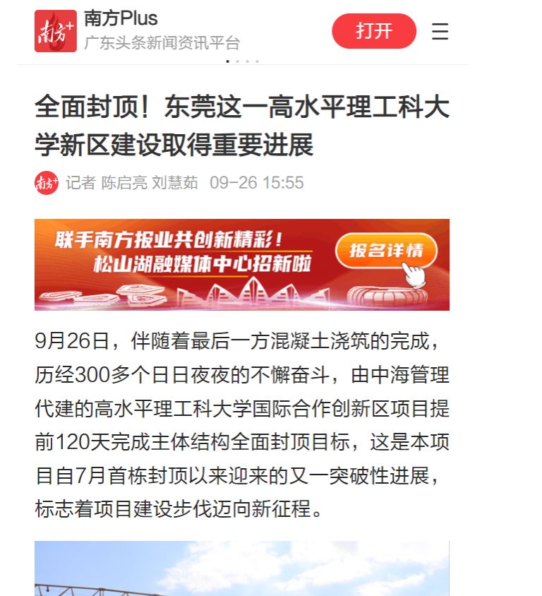9月26日,伴随着最后一方混凝土浇筑的完成,历经300多个日日夜夜的不懈奋斗,由中海管理代建的高水平理工科大学国际合作创新区项目提前120天完成主体结构全面封顶目标,这是本项目自7月首栋封顶以来迎来的又一突破性进展,标志着项目建设步伐迈向新征程。
