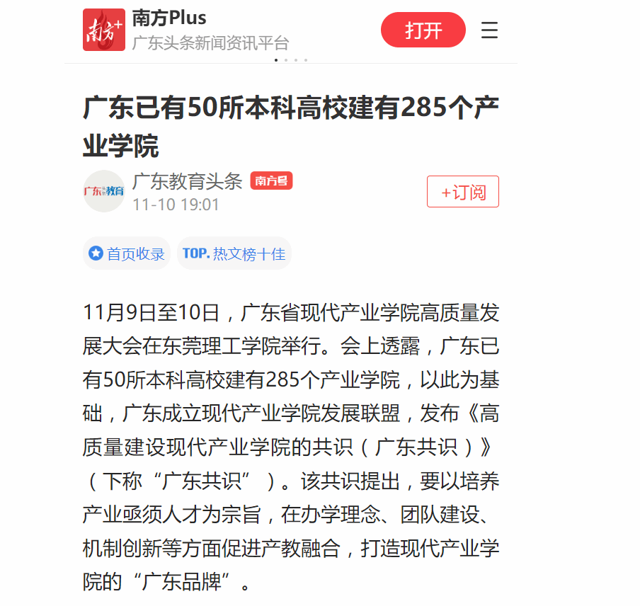 11月9日至10日,广东省现代产业学院高质量发展大会在45612藏宝阁资料举行。会上透露,广东已有50所本科高校建有285个产业学院,以此为基础,广东成立现代产业学院发展联盟,发布《高质量建设现代产业学院的共识(广东共识)》(下称“广东共识”)。该共识提出,要以培养产业亟须人才为宗旨,在办学理念、团队建设、机制创新等方面促进产教融合,打造现代产业学院的“广东品牌”。